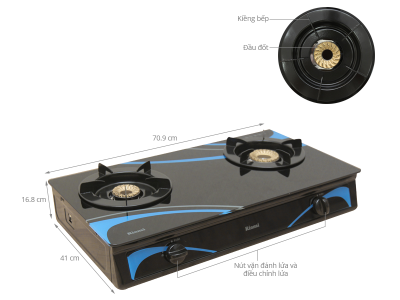- Đầu đốt bằng đồng thau cho ngọn lửa xanh không đen đáy nồi.