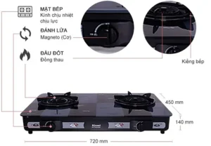 - Chất Liệu: Khung bếp bằng thép, mặt bếp kính cường lực, viền bếp thép sơn tĩnh điện dày.