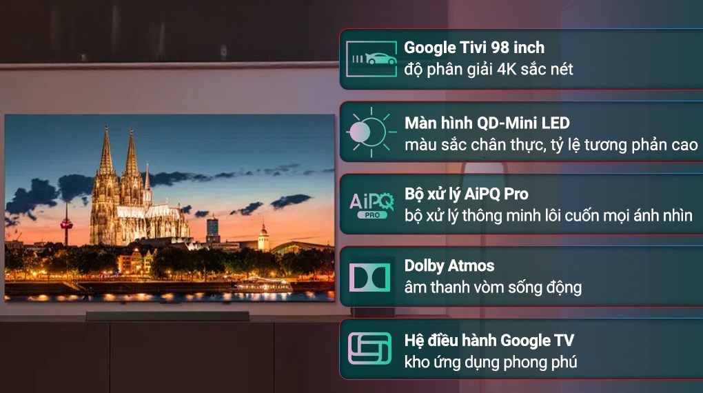 - Màn hình 98 inch, độ phân giải 4K UHD hiển thị rõ nét, chân thực.