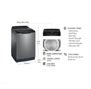 - Khối lượng giặt lớn tới 14kg, thích hợp sử dụng cho gia đình đông người