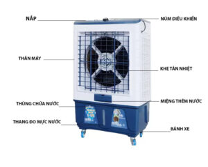 Quạt làm mát, tạo hơi nước làm dịu không khí với tiện ích: có bánh xe di chuyển, dung tích chứa nước 40 lít , lọc không khí , 3 cấp độ gió, tự động dảo trái phải.