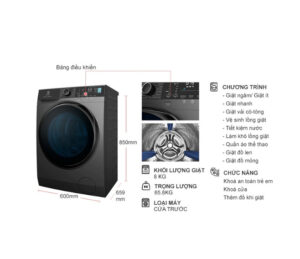 - Khối lượng giặt 8kg, đáp ứng tốt nhu cầu sử dụng gia đình đông thành viên